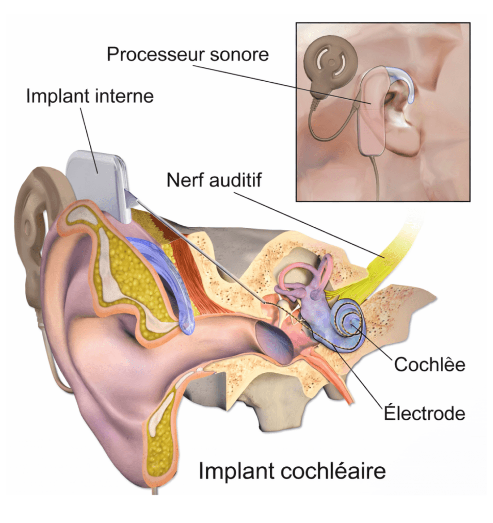 - Les implants cochléaires, parce qu’ils ont une pièce interne, nécessitent une intervention chirurgicale.